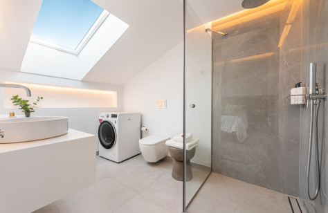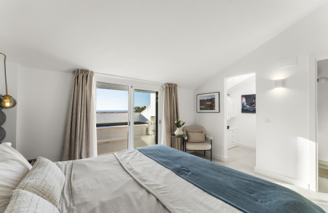 En la planta superior se encuentran dos dormitorios en suite, destacando la suite principal con vestidor y terraza privada con piscina climatizada y vistas panorámicas al mar.