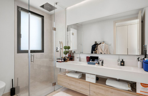La planta principal alberga un amplio salón-comedor con cocina moderna equipada con electrodomésticos NEFF, con acceso directo a una terraza con zona BBQ y piscina climatizada, creando una perfecta conexión entre interior y exterior.